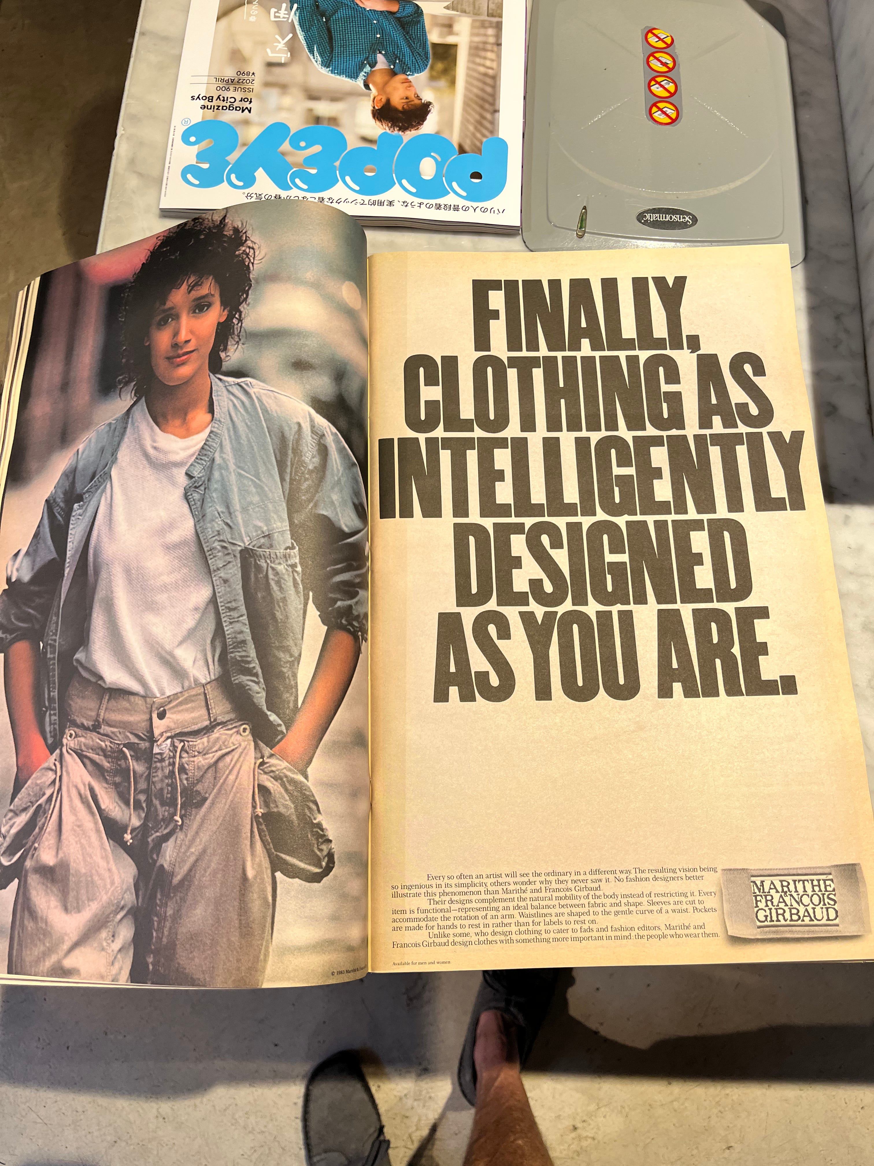Martha & Francois Girbaud ad spread from 1984 issue of Interview. JCrew is stocking Japanese mags now, and showcasing old pubs. Small, smart changes led (I presume) by new creative director Brendon Babenzien.