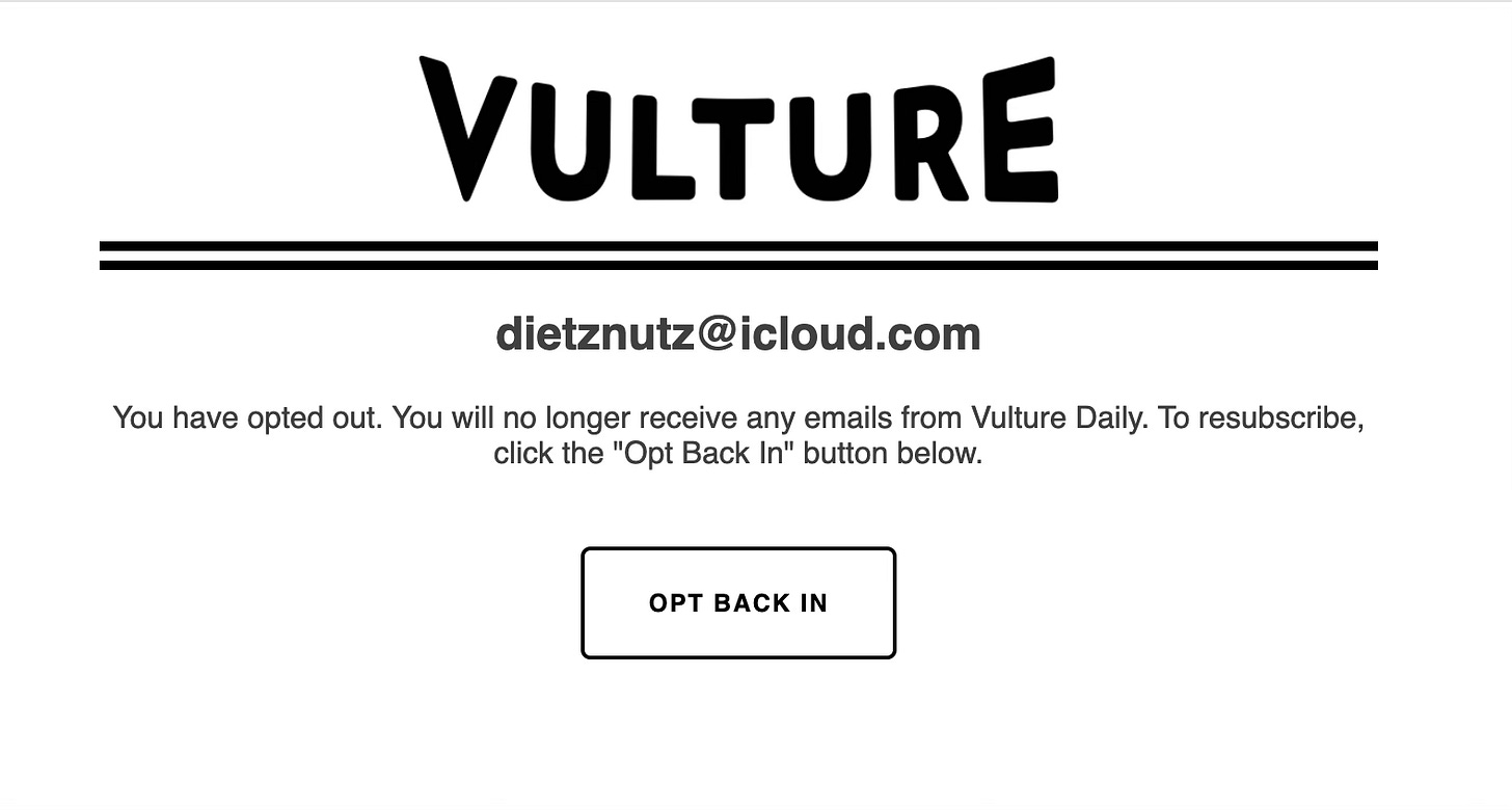 Second, and more saliently, because I have been trying to say goodbye to DP’s sibling newsletter from Vulture for nearly 18 months. I’m on record [multiple times] about how I click ‘unsubscribe’ *every day* on the Vulture newsletter, am redirected to a URL that looks like this: